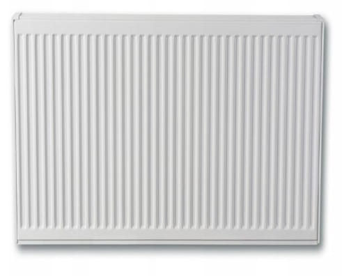 Płytowy grzejnik kompaktowy z osłonami, z podłączeniem z boku.