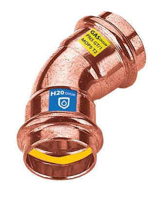 Łuk miedziany fi 15/45° zaprasowywany GAZ/WODA Frabo Gama złączek zaprasowywanych z miedzi i brązu, które można stosować niezależnie do zastosowań wodnych i gazowych,