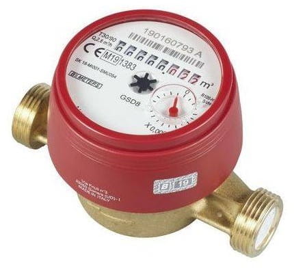 Wodomierz jednostrumieniowy , suchobieżny wyposażony w ośmiobębenkowe liczydło obracane o 360 .