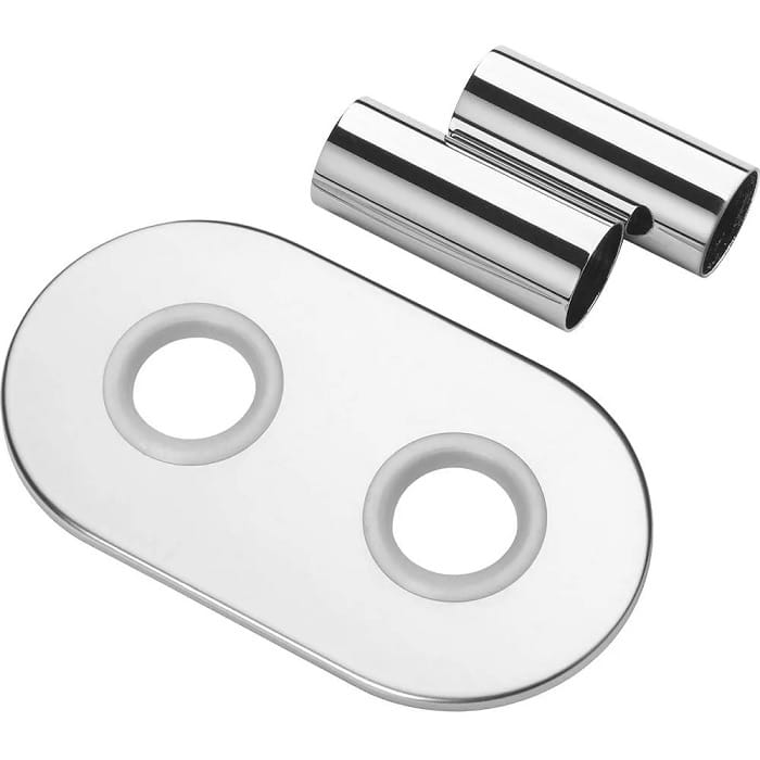 • W komplecie – podwójna owalna rozeta (65x115 mm), dwie tuleje długości o 50 mm, dwa o-ringi w kolorze rozet utrzymujące ją przy ścianie.