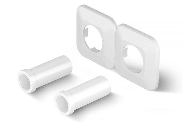 Zestaw maskujący uniwersalny składa się z rozety podwójnej rozdzielnej oraz tulei maskujących do armatury grzewczejW skład zestawu wchodzą:
