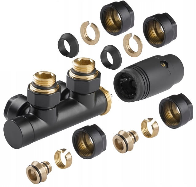 Ekskluzywny czarny zestaw termostatyczny typu Duoplex jest przeznaczony do podłączenia grzejników łazienkowych